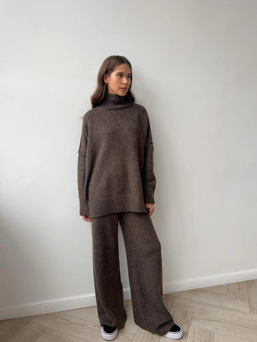This cozy two-piece sweater set is your new go-to for effortless style. The soft wool-blend knit features a chic turtleneck and oversized top with trendy side slits, paired with relaxed wide-leg pants that feel as good as they look. Mix and match the pieces or wear them together for a polished, comfortable vibe that works for lounging, casual outings, or layering through the cooler months.