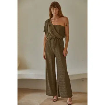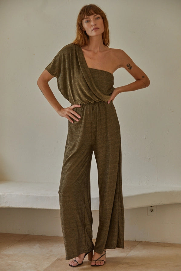 This sophisticated one-shoulder jumpsuit features a draped design with wide legs. Crafted from a luxurious blend of 75% cotton, 20% metallic fibers, and 5% spandex, it showcases a striking gold and black fabric that effortlessly combines comfort with elegance.