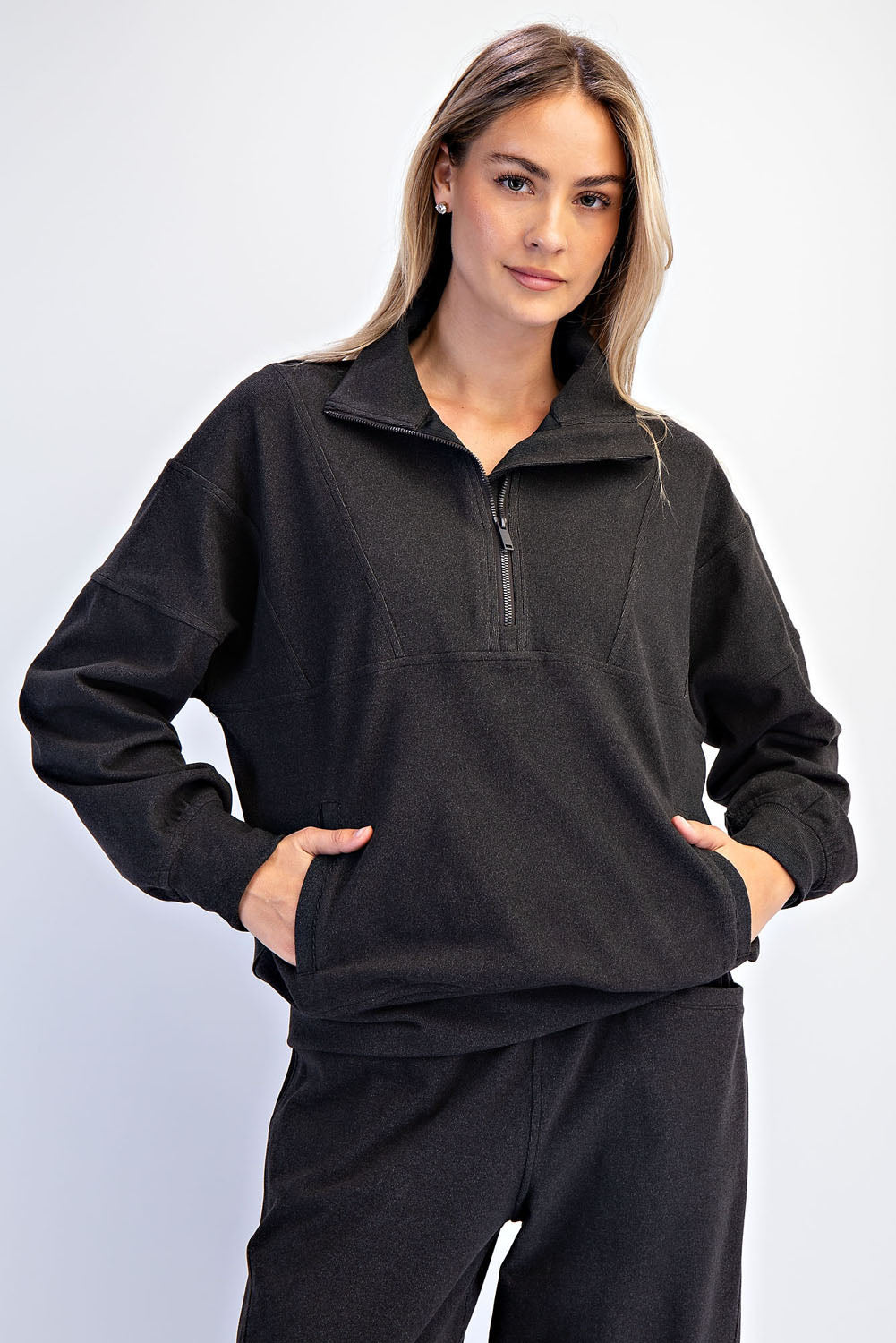 Experience pure coziness with this brushed rib quarter zip pullover, where plush double-sided fabric meets laid-back style. The oversized silhouette and dropped shoulders create an effortlessly chic vibe, while the mock neck and quarter zip let you customize your comfort level. Practical front pockets and refined seam details complete the look. Crafted from a buttery-soft blend of 90% polyester and 10% spandex, this pullover is your new go-to for relaxed days and cozy nights.