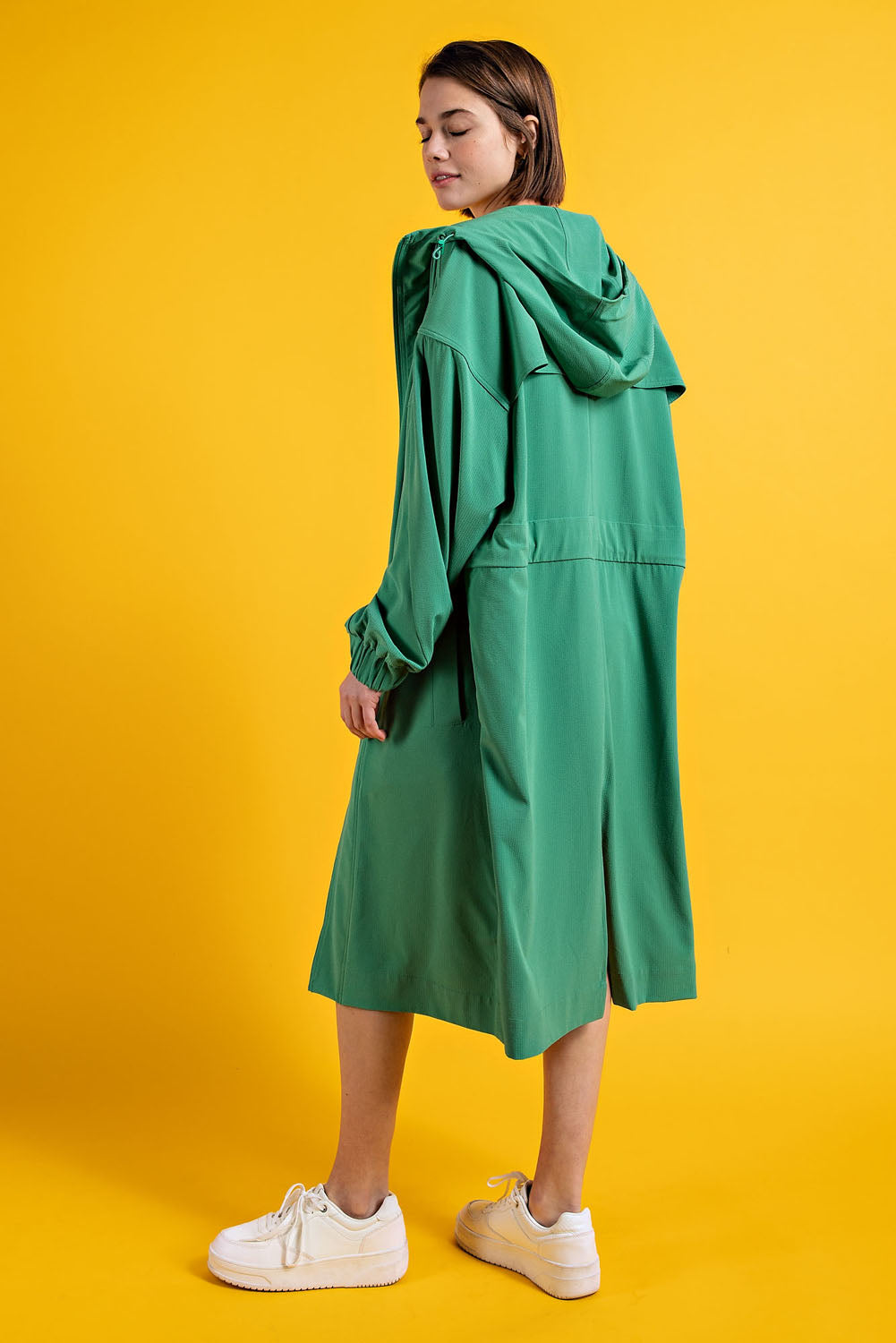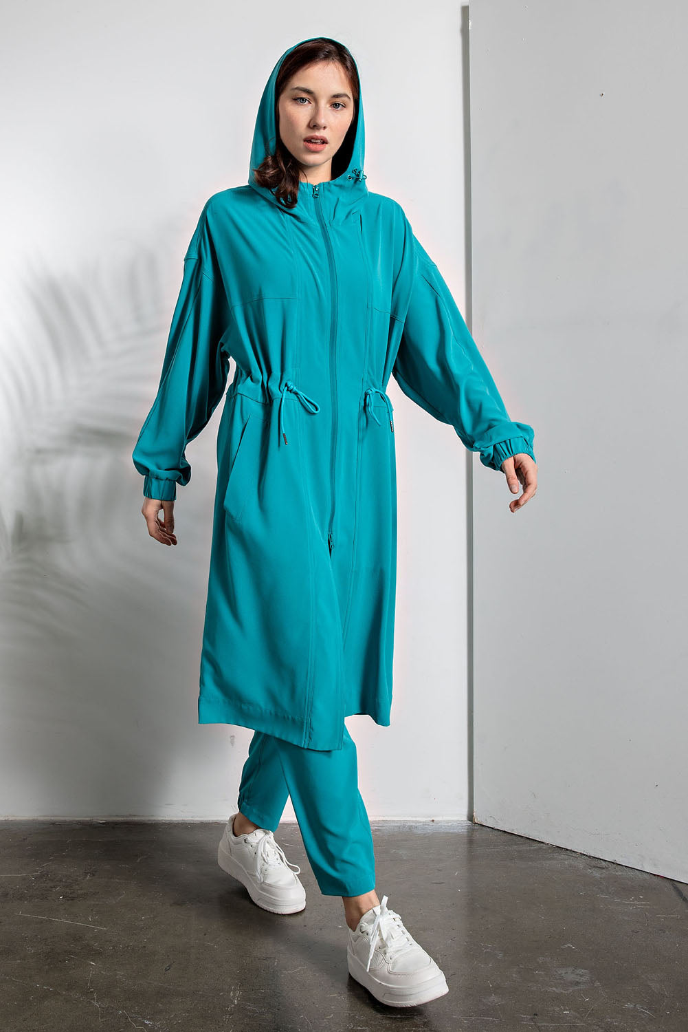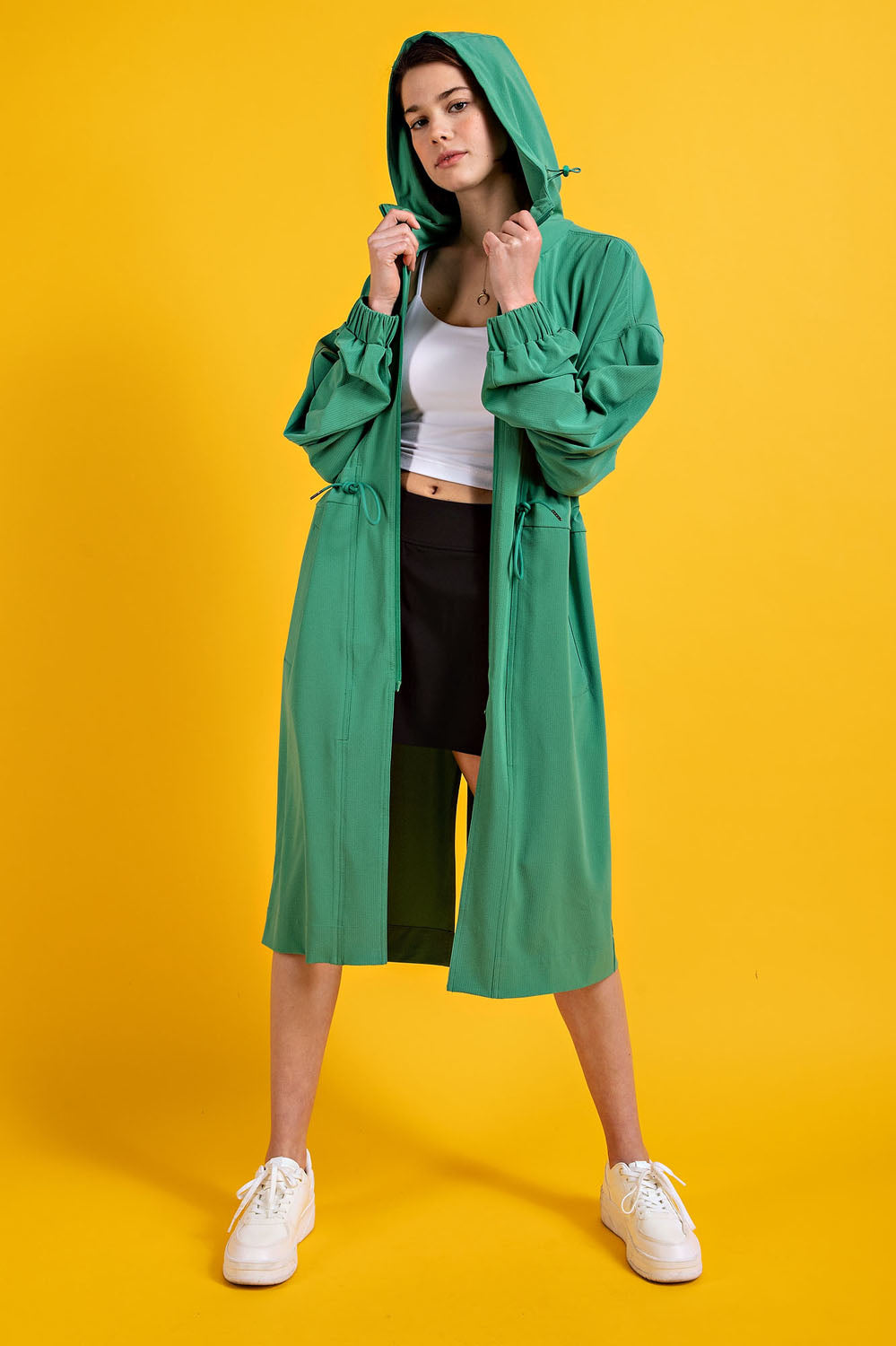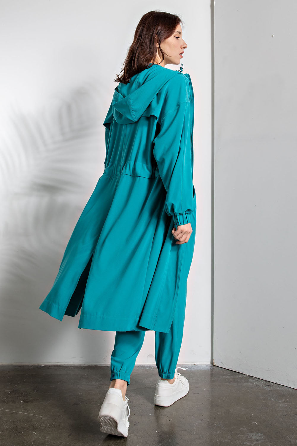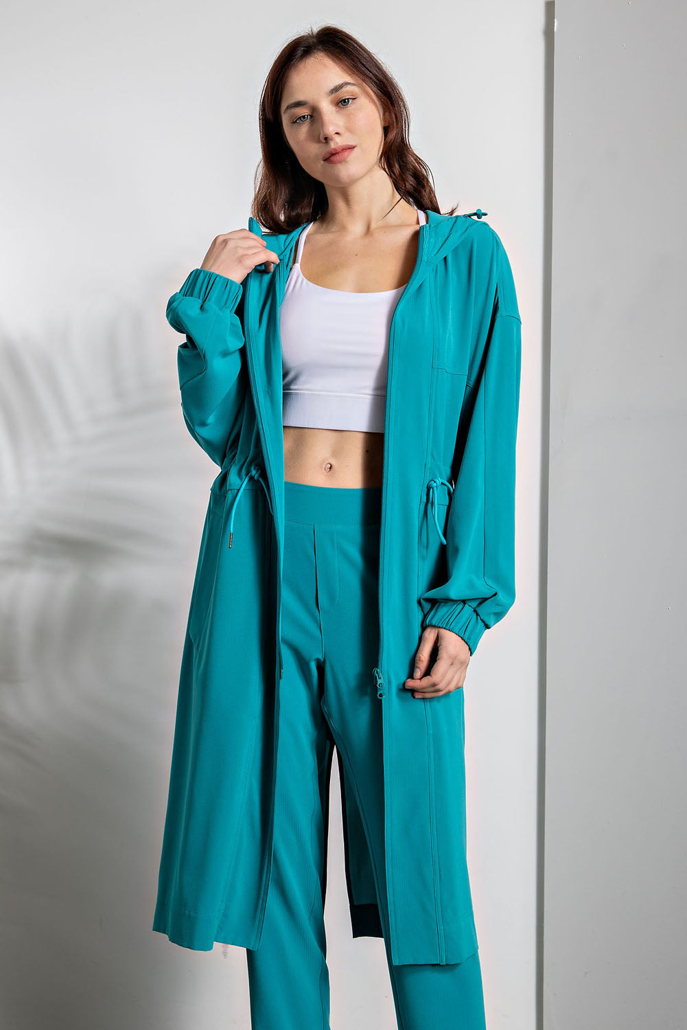 Layer up with effortless cool in this crinkle woven hoodie jacket that's got all the right moves. The textured fabric drapes beautifully while the relaxed long silhouette keeps things comfy and casual. Zip it up, toss on the drawstring hood, and slip your hands into the side pockets—because pockets are always a win. Front and back slits add just enough edge to keep your vibe interesting. Crafted from a stretchy polyester-spandex blend that moves with you, this jacket pairs perfectly with the matching bottom set. Style # P6231. Model pictured is 5'9" wearing size Small.