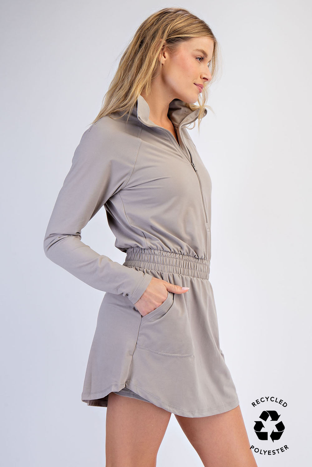 Mary Grace is your go-to mini dress for anything life throws at you. Built from soft, stretchy recycled microfiber, it features practical built-in shorts and pockets so you're always ready. The quarter zipper and mock neck let you style it your way, while the dropped shoulders and elastic waist keep things comfy and flattering. Perfect for workouts or weekend hangs.