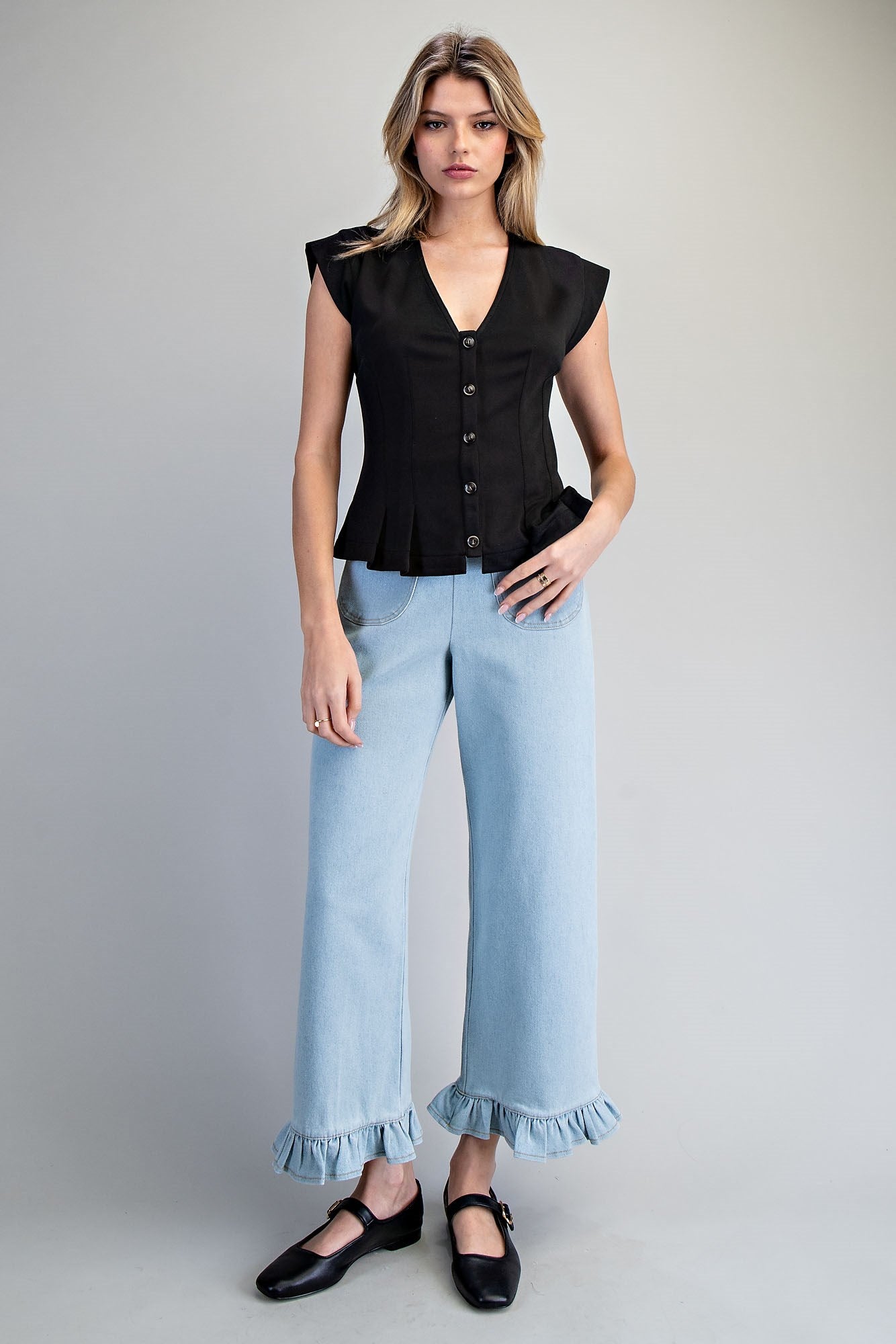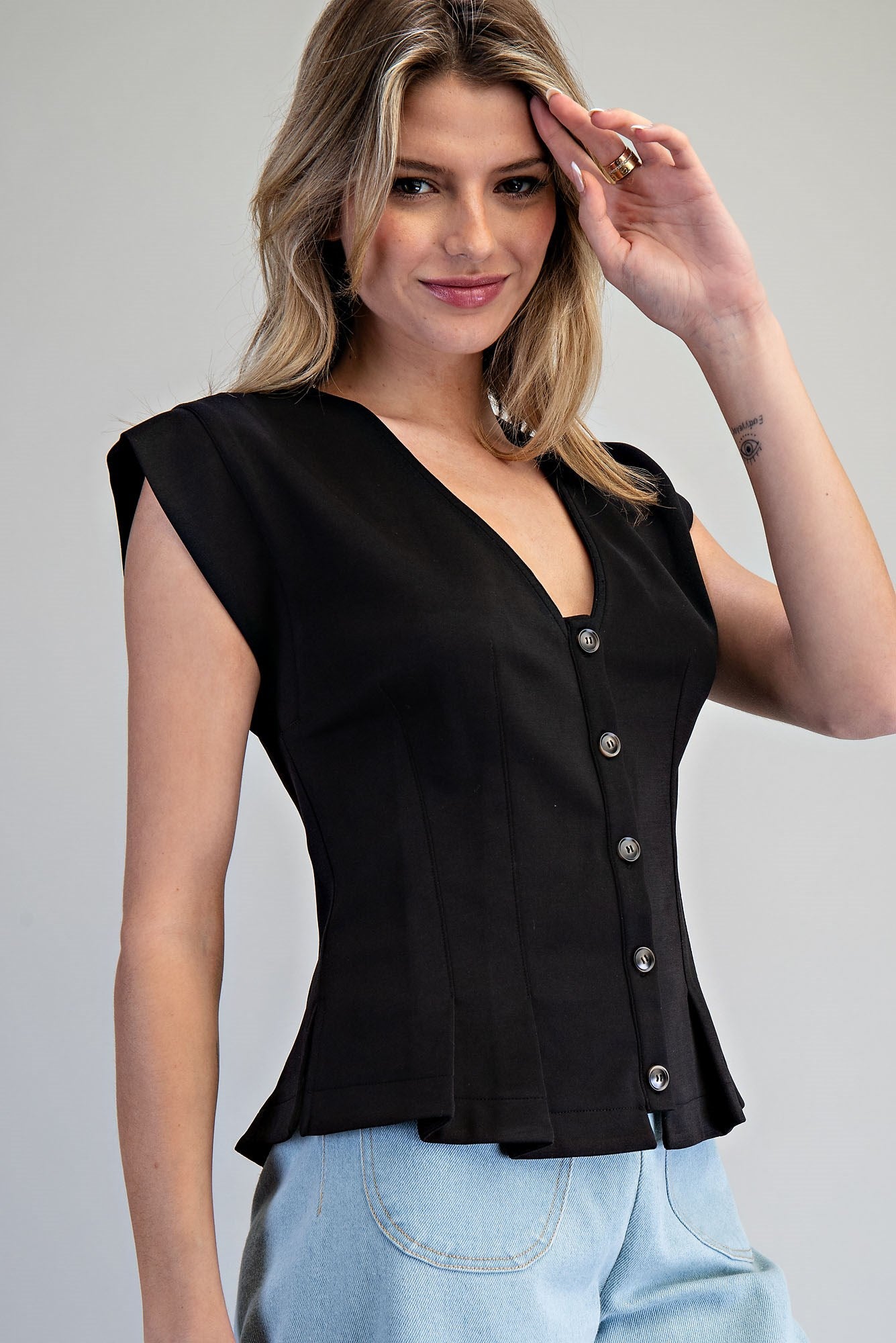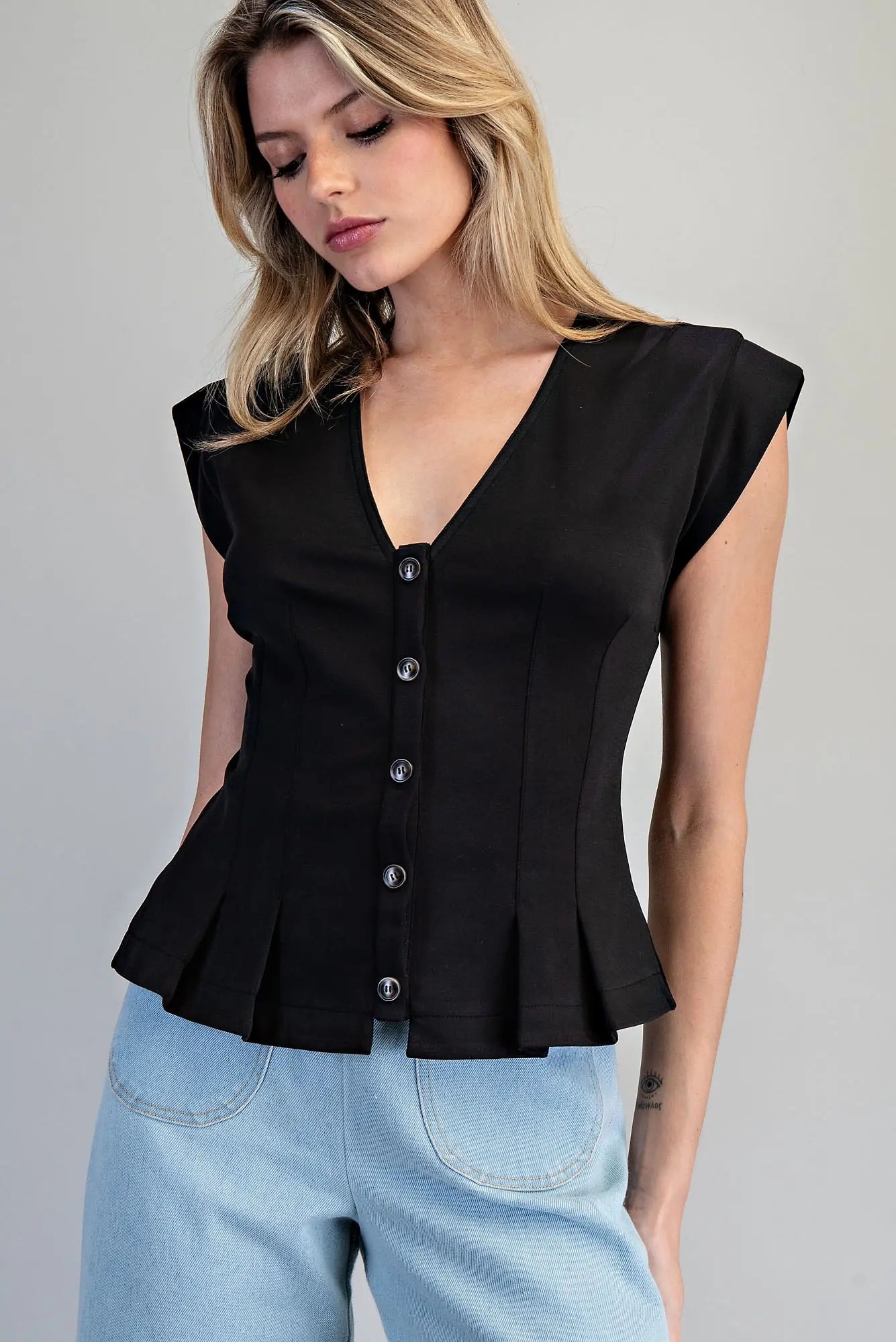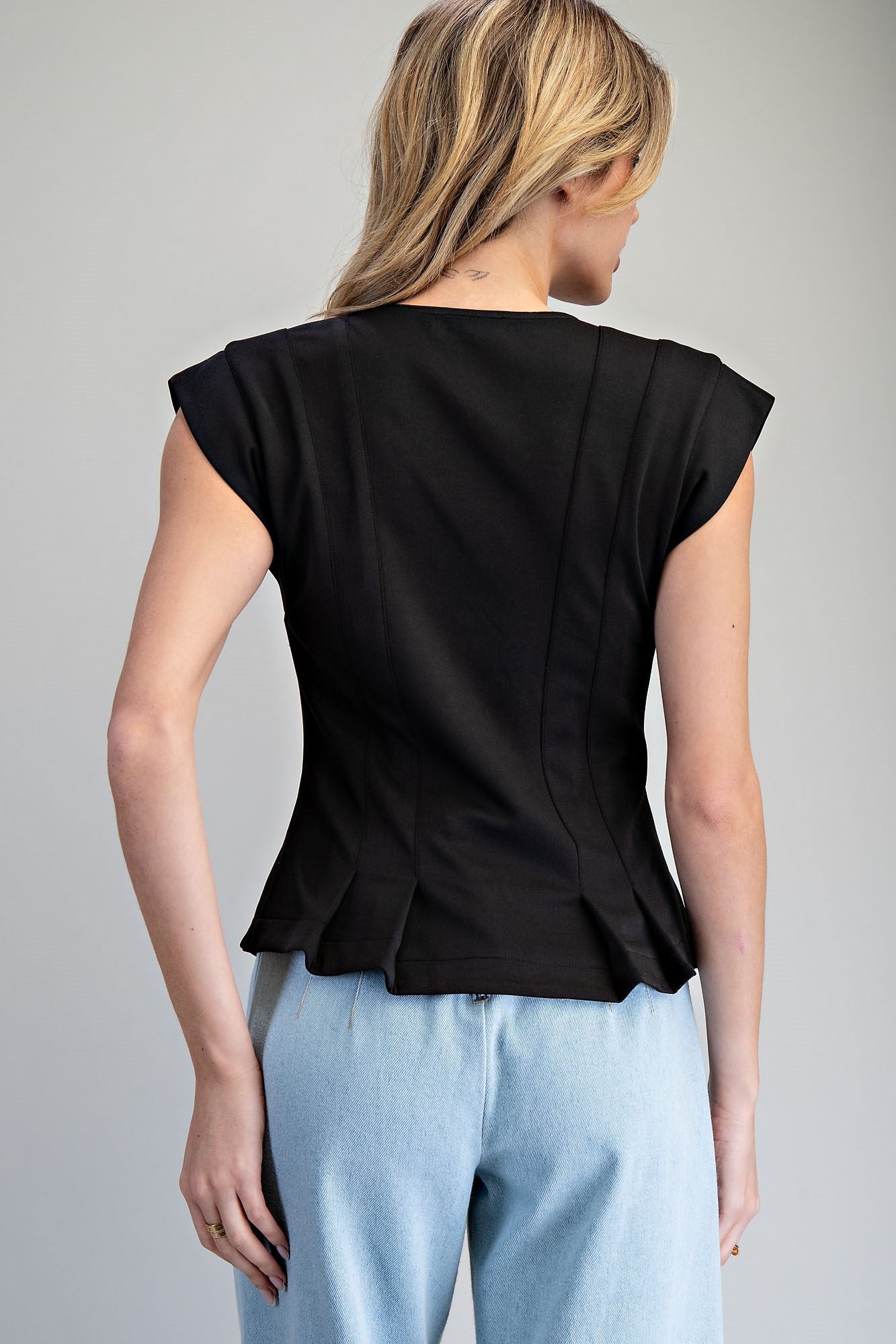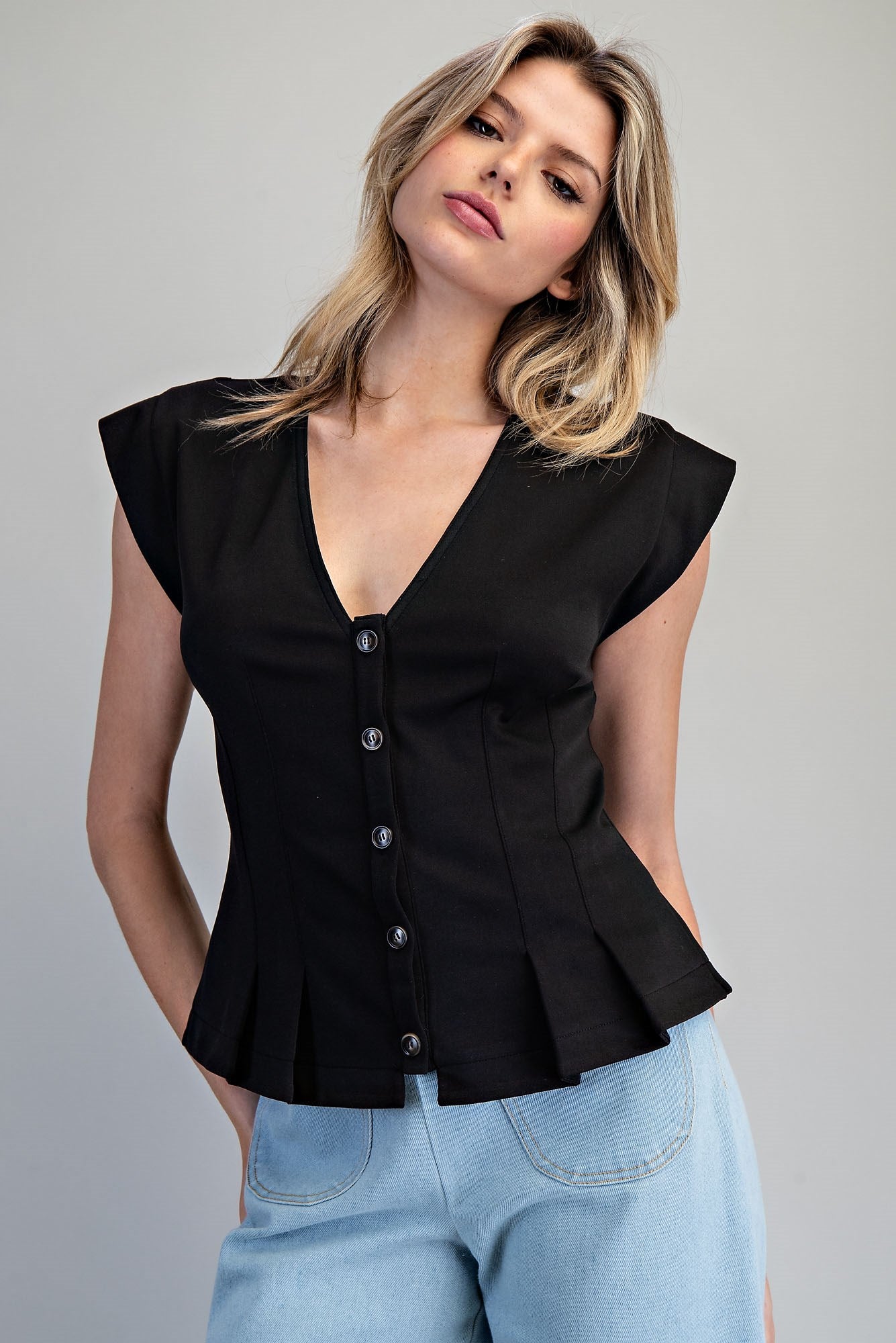 Dare to stand out in this boldly structured V-neck top that commands attention. Featuring sharp extended cap sleeves, striking vertical contour seaming, and a daring button-front closure, this piece delivers serious tailored edge. The flared hem with crisp front pleats creates movement and attitude, while the clean neckline keeps the look refined. Perfect for those who refuse to blend in.