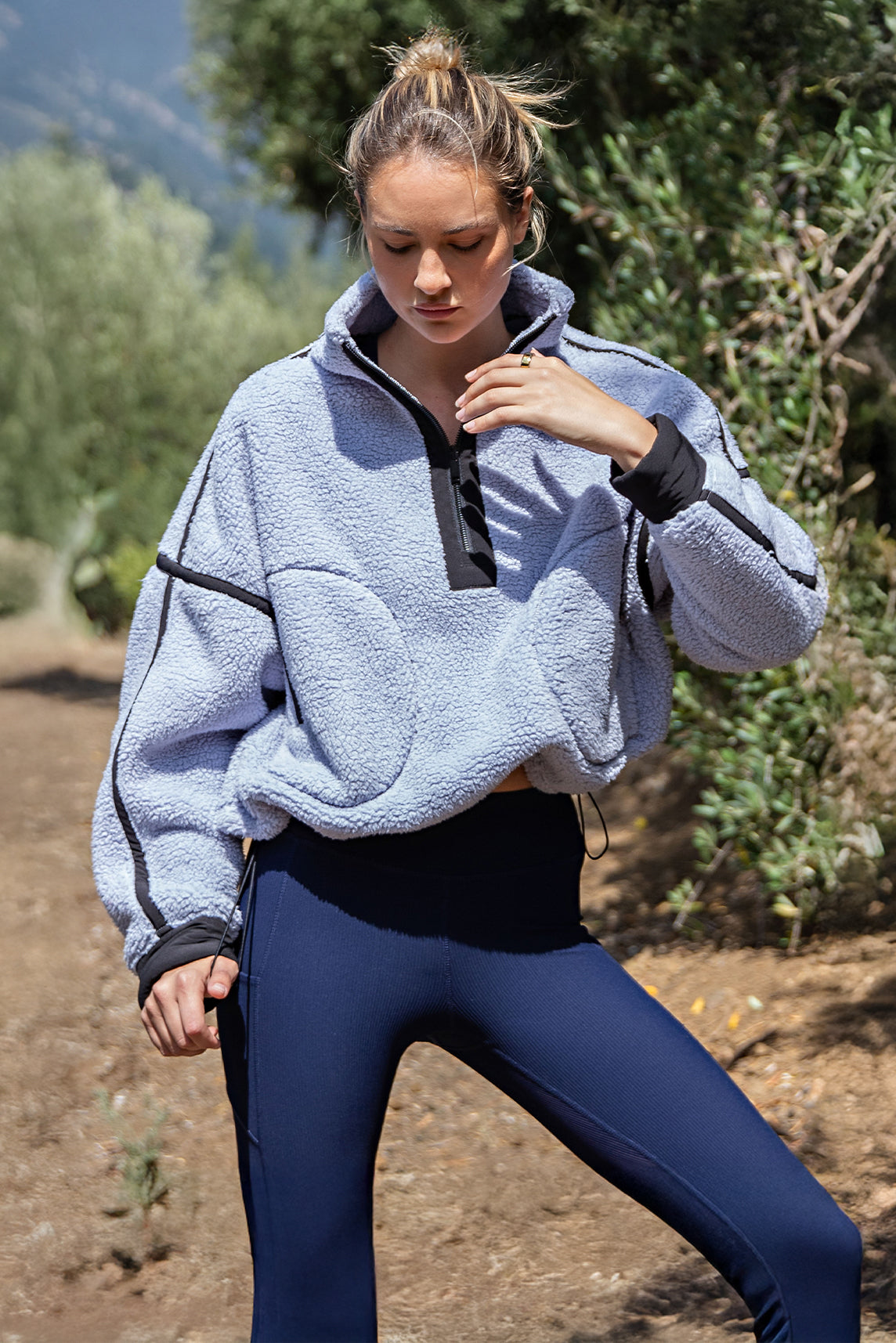 Embrace effortless warmth with this sherpa quarter-zip pullover, engineered for those who value both comfort and style. The lightweight yet plush sherpa construction delivers exceptional softness without excess weight, while the relaxed silhouette—featuring dropped shoulders and a mock neckline—creates an understated, modern aesthetic. A quarter-zip closure provides easy layering versatility, and the adjustable cinchable hem allows you to customize fit and insulation. Practical side pockets complete the design. Crafted from sustainable recycled polyester microfiber blended with spandex for durability and stretch, this piece transitions seamlessly from casual lounging to outdoor adventures on cooler days.